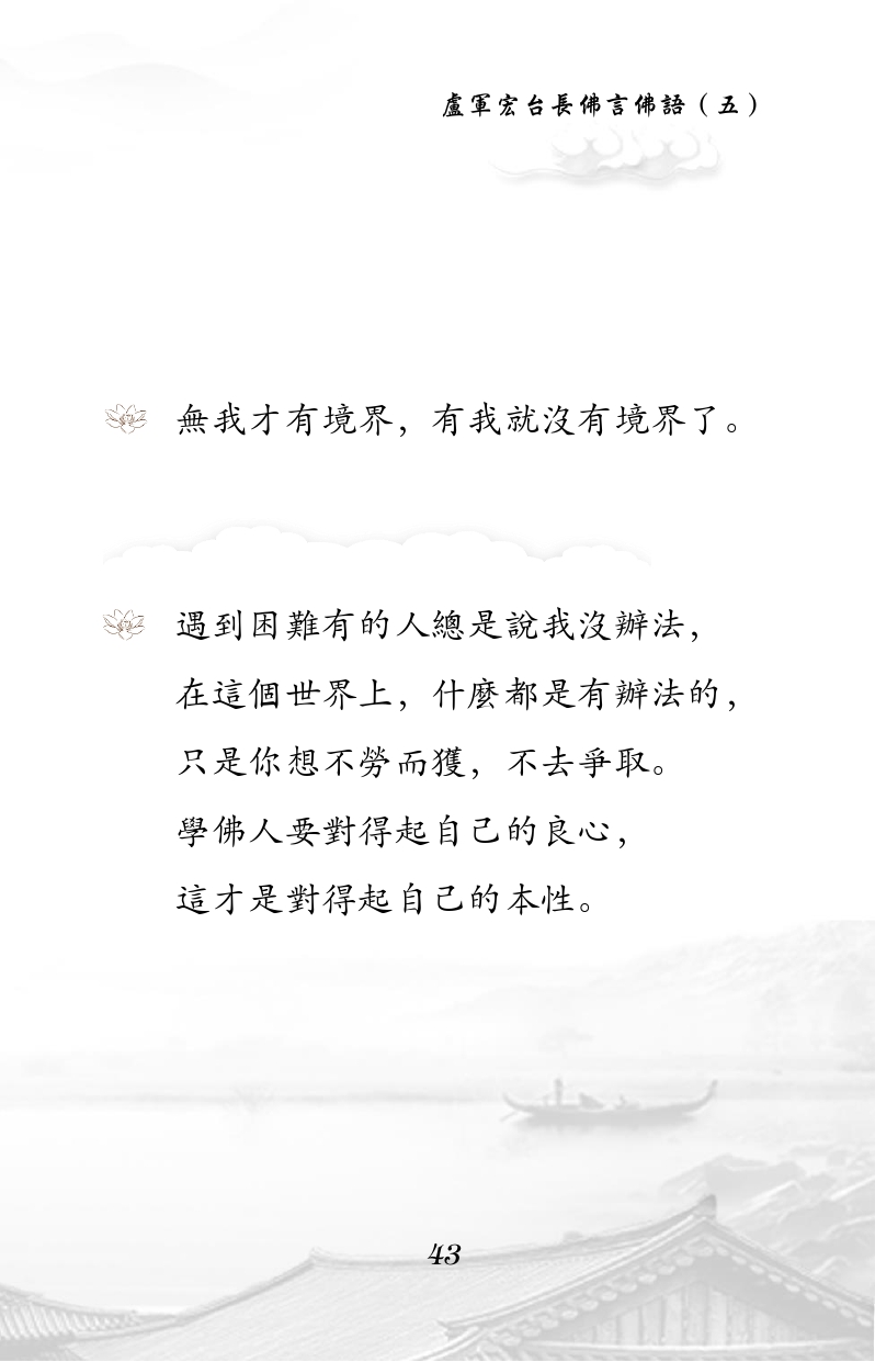 不限会员 无我才有境界,有我就没有境界了。 遇到困难有的人总是说我没办法, 在这个世界上,什么都是有办法的, 只是你想不劳而获,不去争取。 学佛人要对得起自己的良心, 这才是对得起自己的本性。 |佛言佛语 第五册