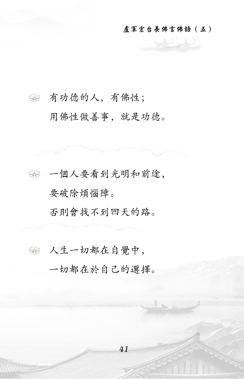 不限会员 有功德的人,有佛性; 用佛性做善事,就是功德。 一个人要看到光明和前途, 要破除烦恼障。 否则会找不到回天的路。 人生一切都在自觉中, 一切都在于自己的选择。 |佛言佛语 第五册