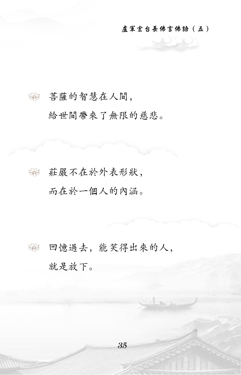 不限会员 菩萨的智慧在人间, 给世间带来了无限的慈悲。 庄严不在于外表形状, 而在于一个人的内涵。 回忆过去,能笑得出来的人, 就是放下。 |佛言佛语 第五册