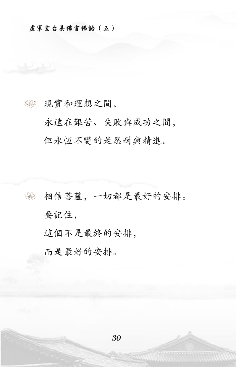 不限会员 现实和理想之间, 永远在艰苦、失败与成功之间, 但永恒不变的是忍耐与精进。 相信菩萨,一切都是最好的安排。 要记住, 这个不是最终的安排, 而是最好的安排。 |佛言佛语 第五册
