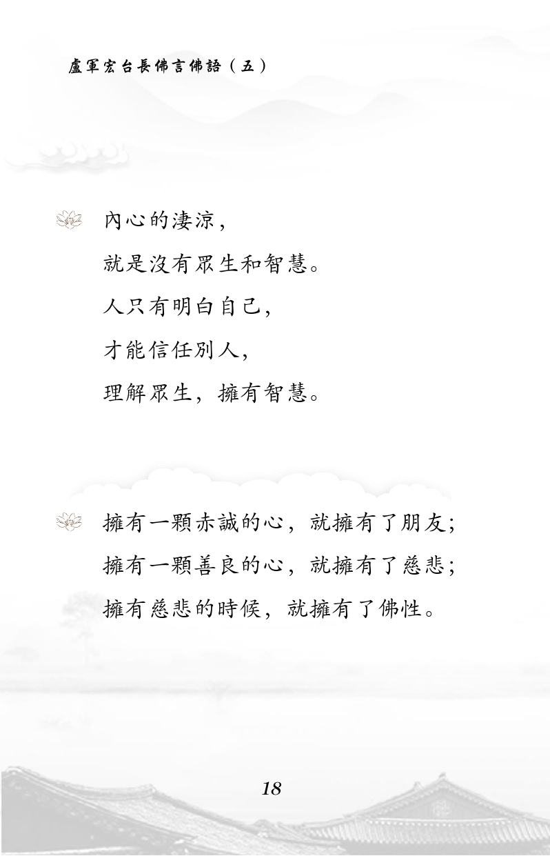 不限会员 内心的凄凉, 就是没有众生和智慧。 人只有明白自己, 才能信任别人, 理解众生,拥有智慧。 拥有一颗赤诚的心,就拥有了朋友; 拥有一颗善良的心,就拥有了慈悲; 拥有慈悲的时候,就拥有了佛性。 |佛言佛语 第五册