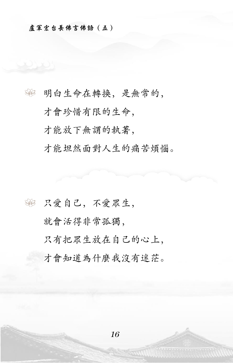 不限会员 明白生命在转换,是无常的, 才会珍惜有限的生命, 才能放下无谓的执着, 才能坦然面对人生的痛苦烦恼。 只爱自己,不爱众生, 就会活得非常孤独, 只有把众生放在自己的心上, 才会知道为什么我没有迷茫。 |佛言佛语 第五册