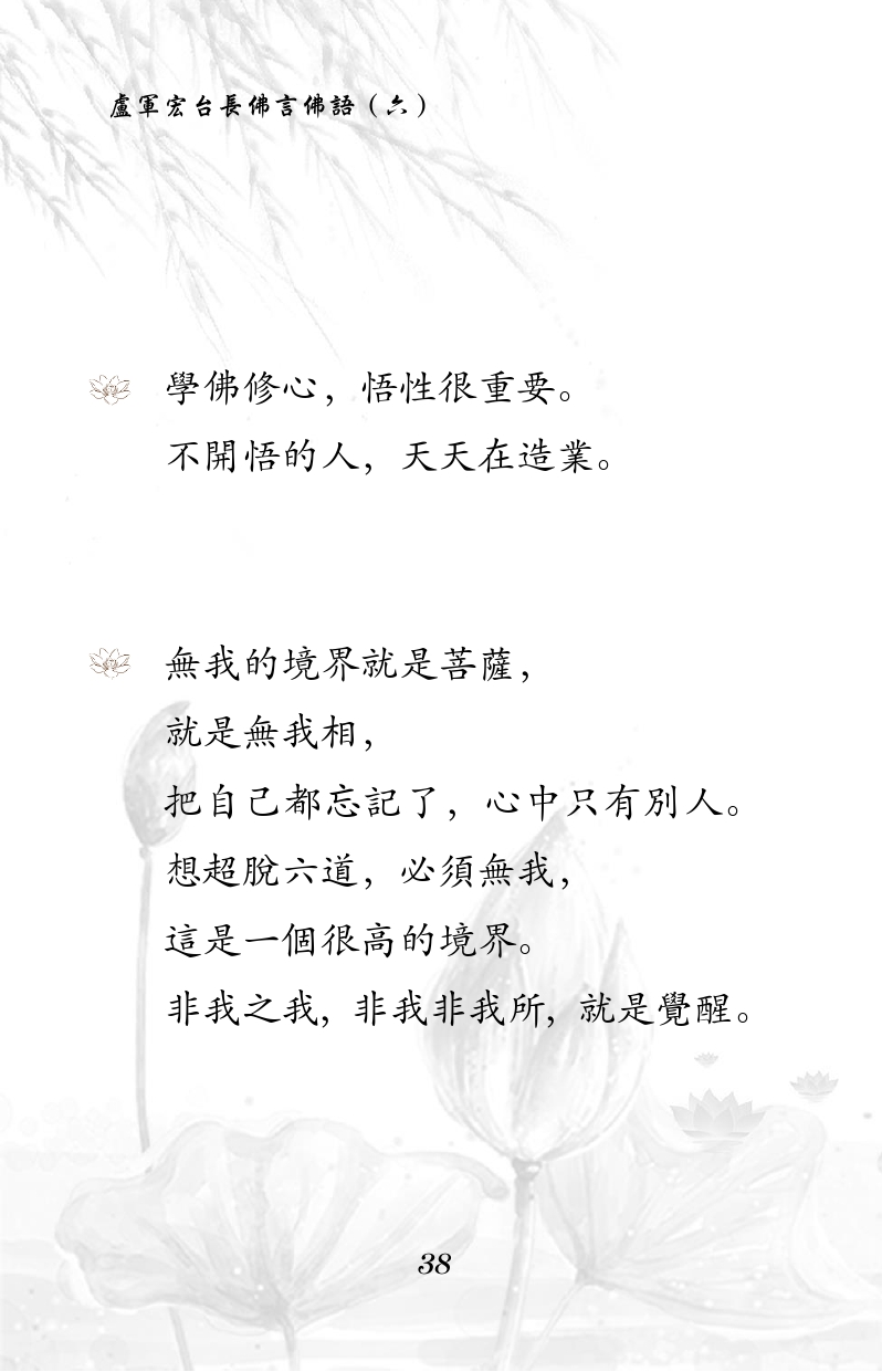 不限会员 学佛修心,悟性很重要。 不开悟的人,天天在造业。 无我的境界就是菩萨, 就是无我相, 把自己都忘记了,心中只有别人。 想超脱六道,必须无我, 这是一个很高的境界。 非我之我,非我非我所,就是觉醒。 |佛言佛语 第六册