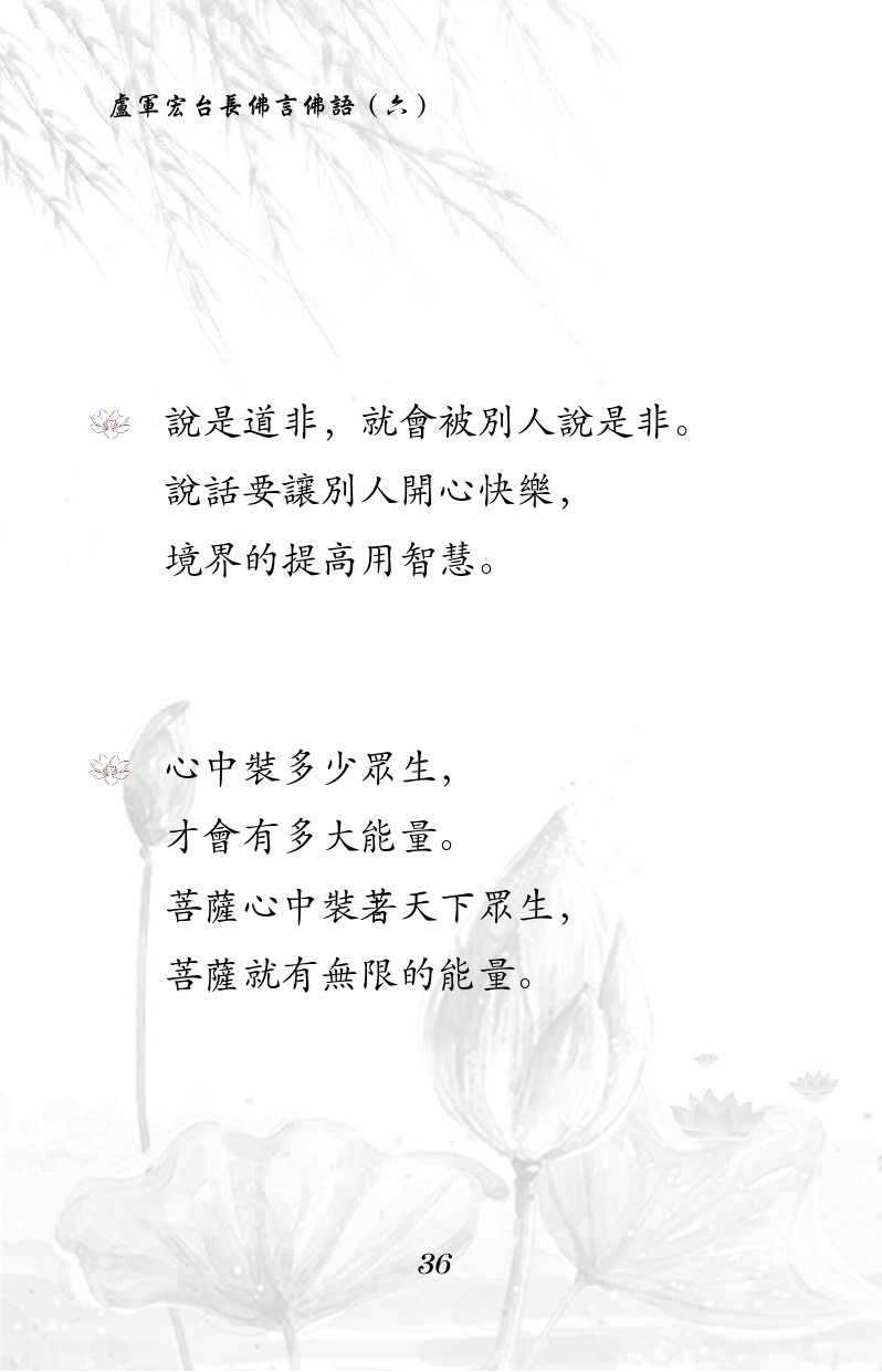 不限会员 说是道非,就会被别人说是非。 说话要让别人开心快乐, 境界的提高用智慧。 心中装多少众生, 才会有多大能量。 菩萨心中装着天下众生, 菩萨就有无限的能量。 |佛言佛语 第六册