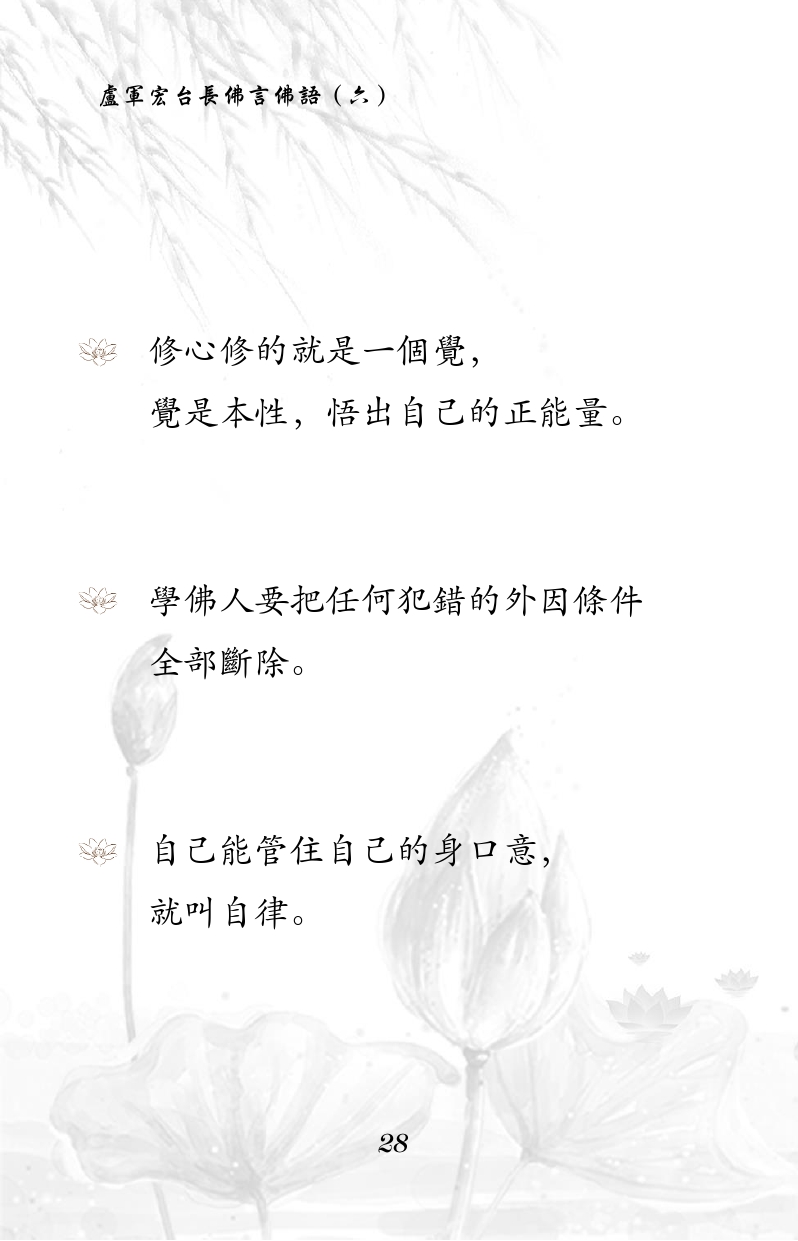 不限会员 修心修的就是一个觉, 觉是本性,悟出自己的正能量。 学佛人要把任何犯错的外因条件 全部断除。 自己能管住自己的身口意, 就叫自律。 |佛言佛语 第六册