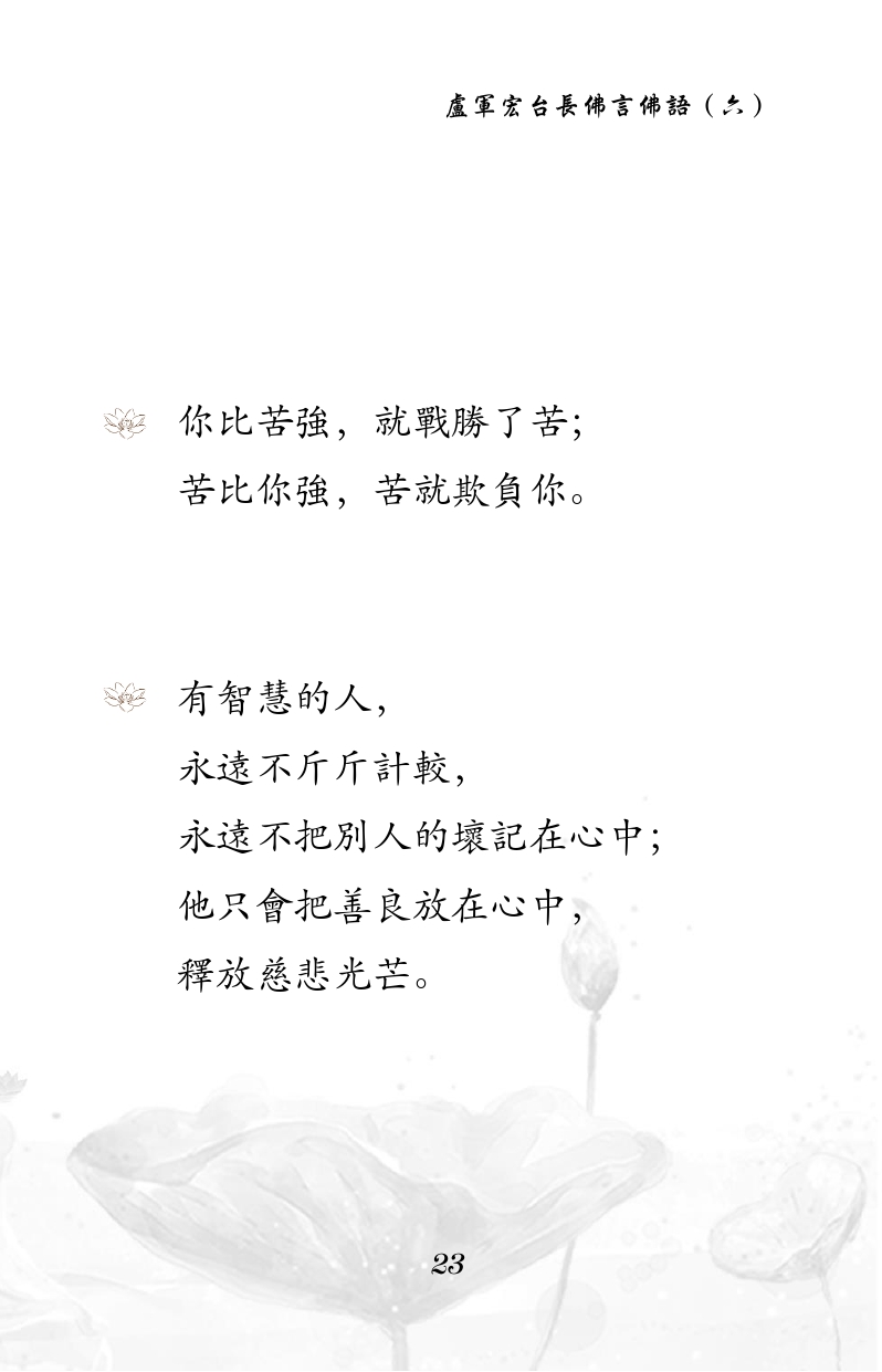 不限会员 你比苦强,就战胜了苦; 苦比你强,苦就欺负你。 有智慧的人, 永远不斤斤计较, 永远不把别人的坏记在心中; 他只会把善良放在心中, 释放慈悲光芒。 |佛言佛语 第六册