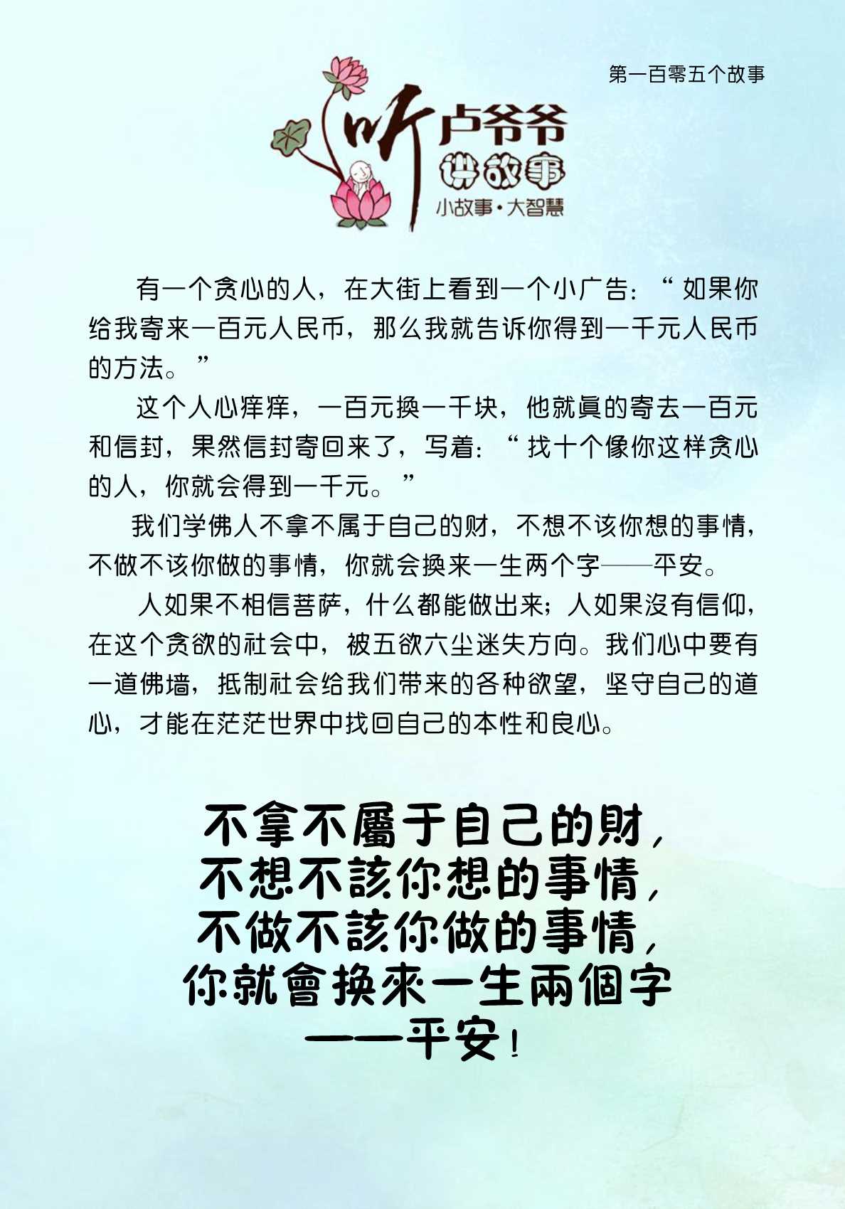 105、不拿不属于自己的财,不想不该你想的事情,不做不该你做的事情,你就会换来一生两个字——平安!