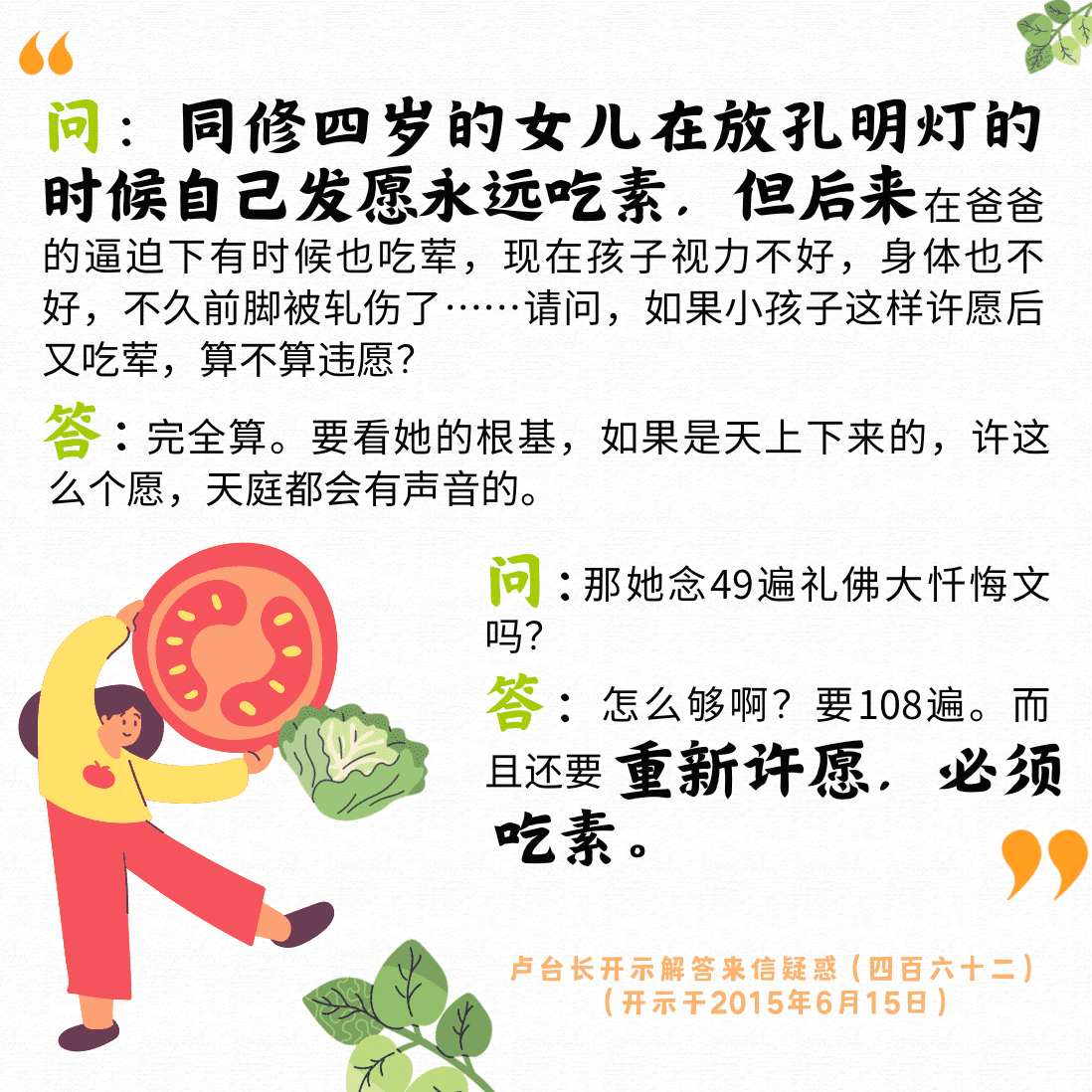 不限会员 同修四岁的女儿在放孔明灯的时候自己发愿永远吃素,但后来在爸爸的逼迫下有时候也吃荤,现在孩子视力不好......【来信疑惑(四百六十二)】