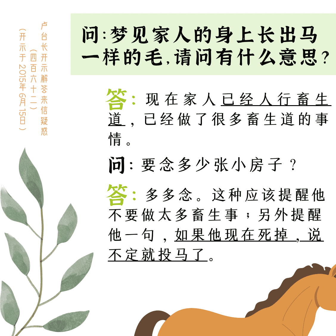 不限会员 问:梦见家人的身上长出马一样的毛,请问有什么意思?【来信疑惑(四百六十二)】