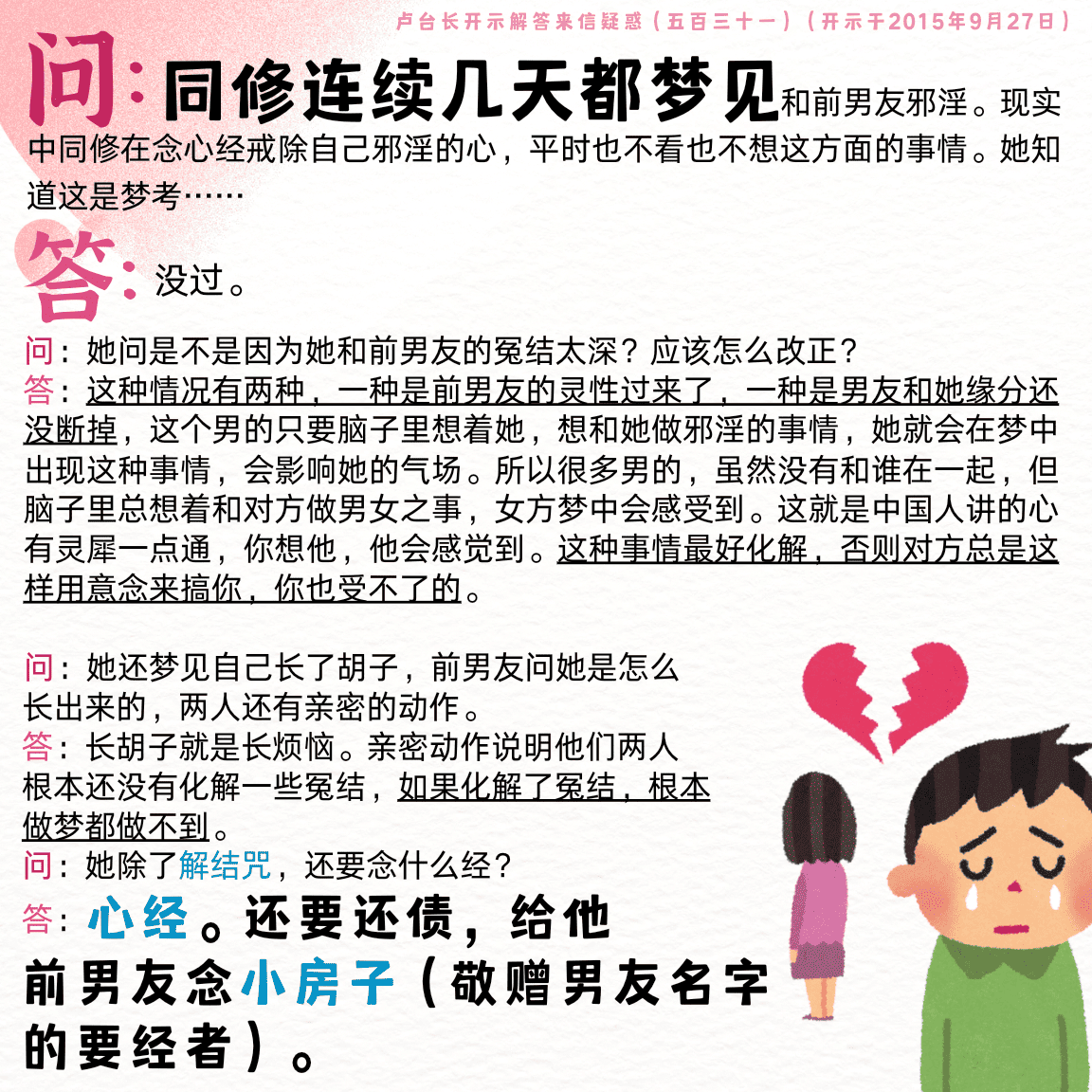 不限会员 问:她问是不是因为她和前男友的冤结太深?应该怎么改正?……她除了解结咒,还要念什么经?答:心经。还要还债,给他前男友念小房子(敬赠男友名字的要经者)。【来信疑惑