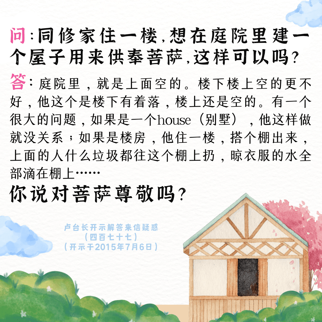 不限会员 问:同修家住一楼,想在庭院里建一个屋子用来供奉菩萨,这样可以吗?【来信疑惑(四百七十七)】