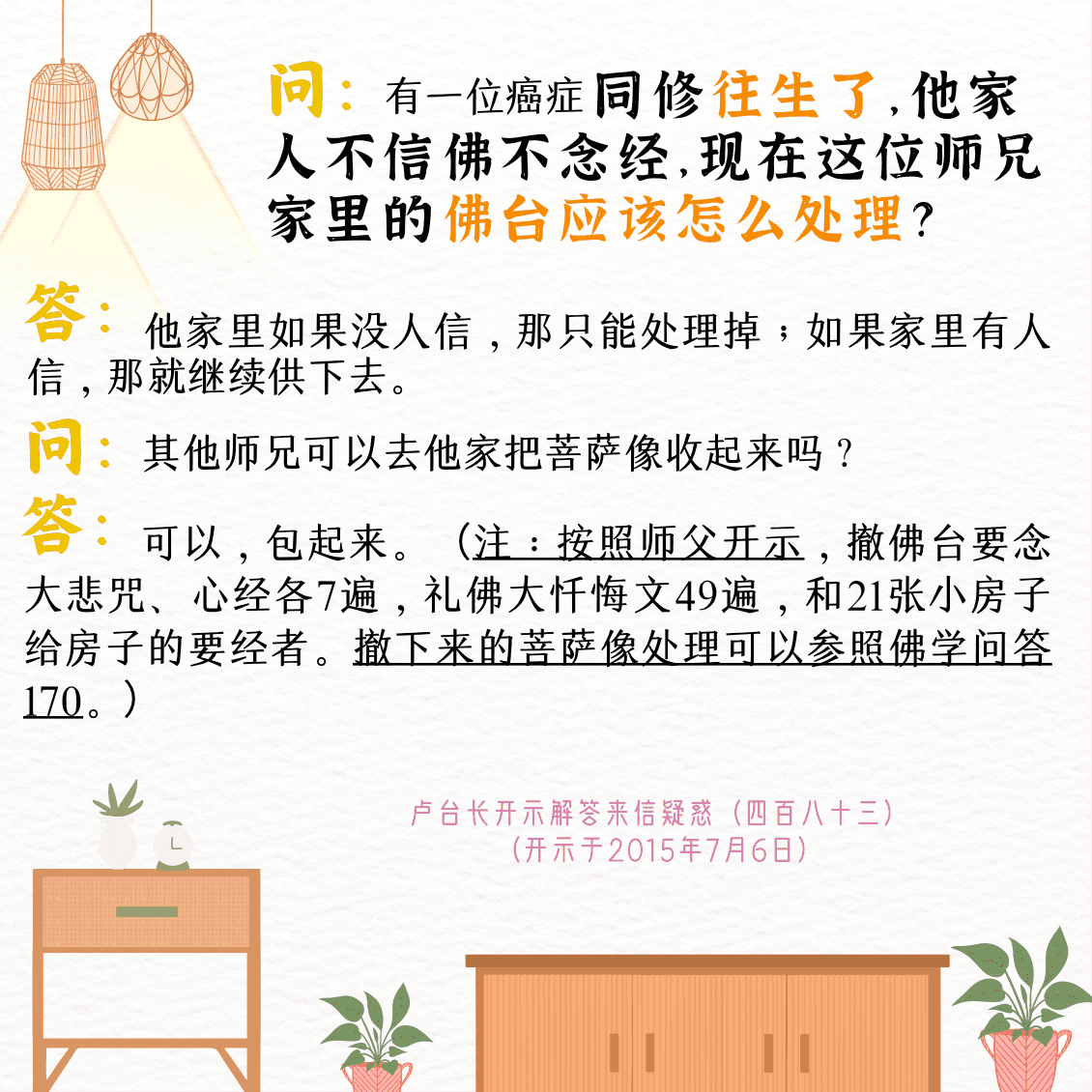 不限会员 问:有一位癌症同修往生了,他家人不信佛不念经,现在这位师兄家里的佛台应该怎么处理?【来信疑惑(四百八十三)】