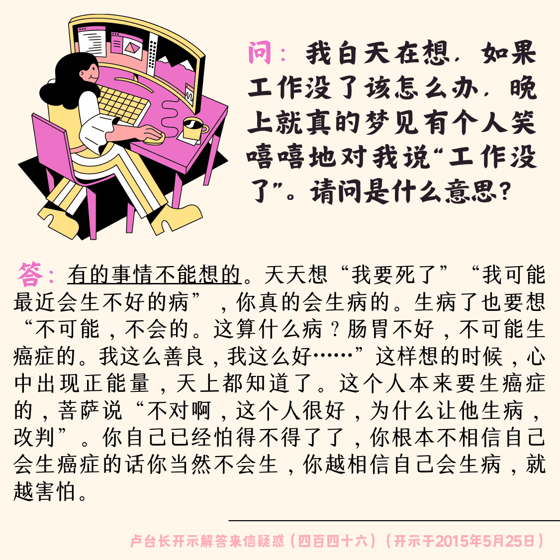 不限会员 有的事情不能想的。天天想“我要死了”“我可能最近会生不好的病”,你真的会生病的。【来信疑惑(四百四十六)(开示于2015年5月25日)】